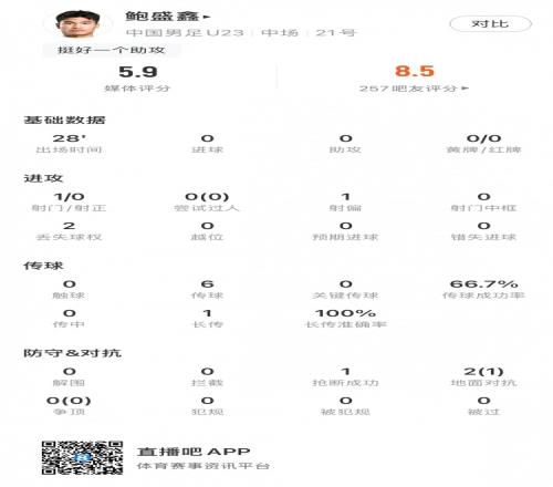 体育播报1月25日宣 U23亚洲杯决赛,U23国足0-4不敌日本U23,夺得赛事亚军。替补出战的鲍盛鑫数据如下: